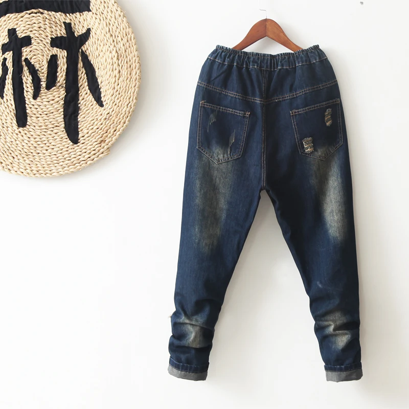 discounted Autumn Vintage Flower Embroidered jeans Women Elastic Waist Loose Plus Size Haren Pants Denim Trous