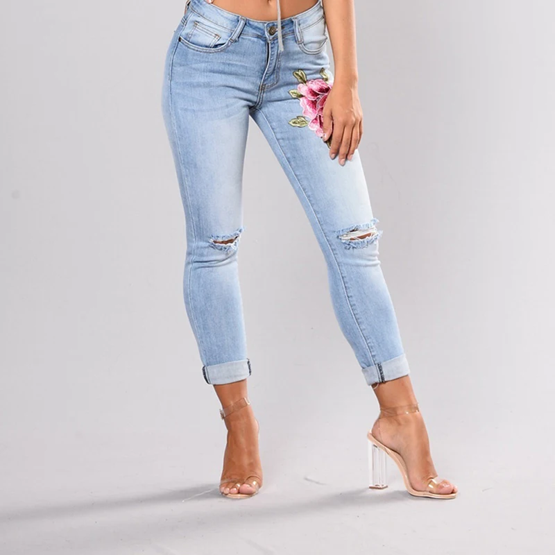 amazing Stretch Embroidered Jeans For Women Elastic Flower Jeans Female Slim Denim Pants Hole Ripped Rose P