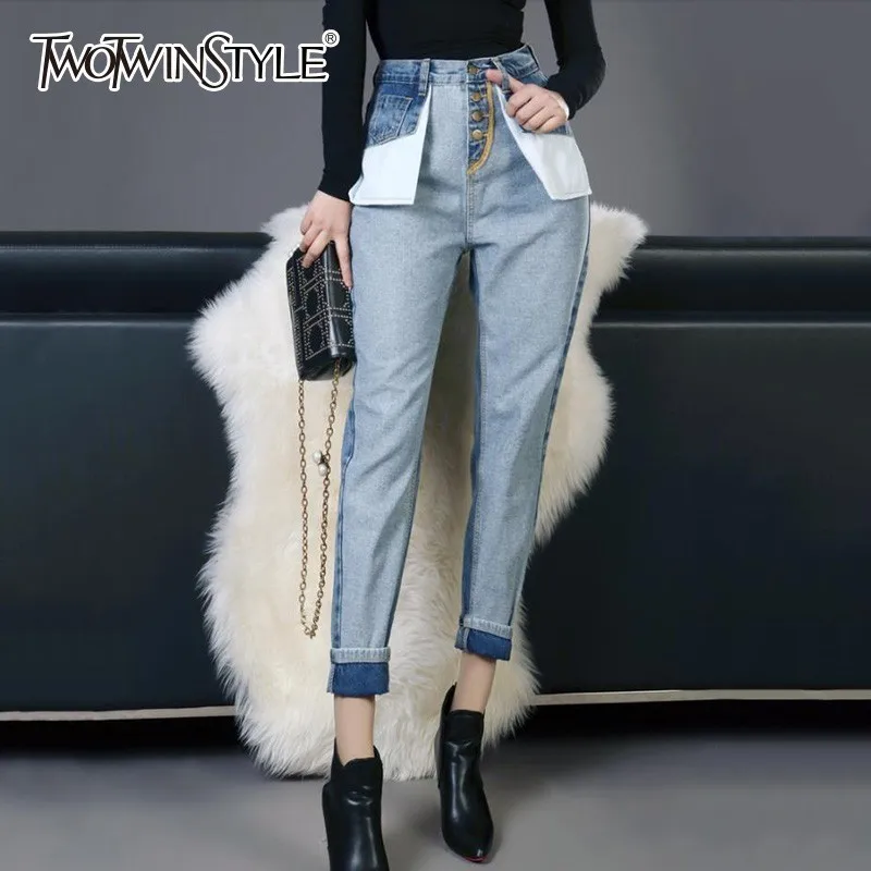 astounding TWOTWINSTYLE Denim Trousers For Women High Waist Hit Colors Patchwork Pockets Ankle Length Jeans Fe