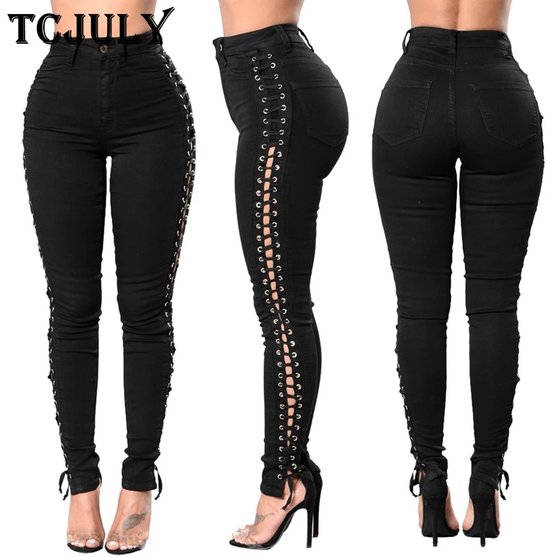 Best TCJULY Stylish Hollow Out Criss Cross Tie Up Black Jeans With High Waist Stretchy Push Up Skinny Pe