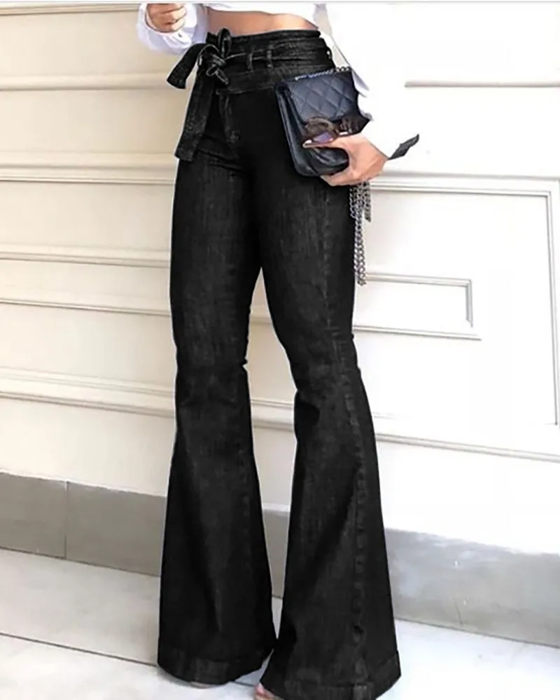 Ideal Women High Waist Bandage Wide Leg Denim Jeans Ladies Stretch Fare Long Pants