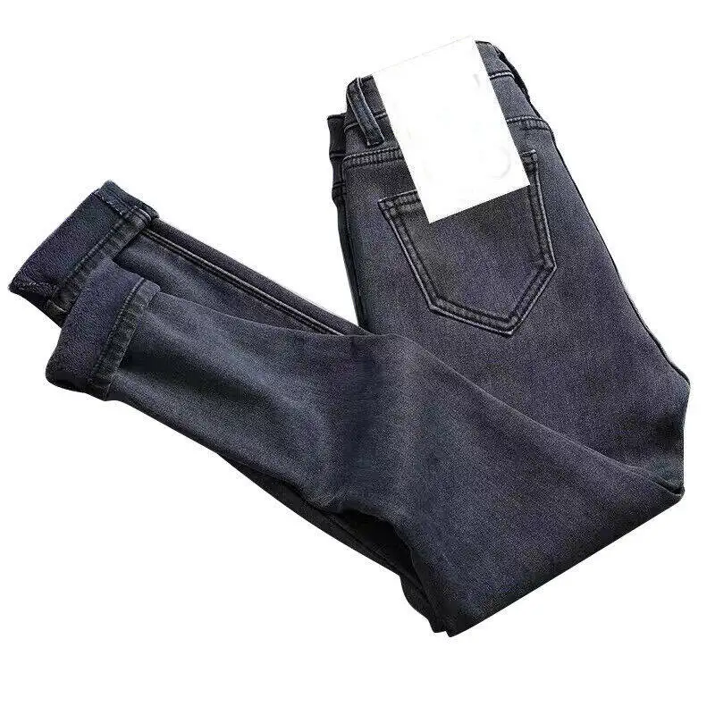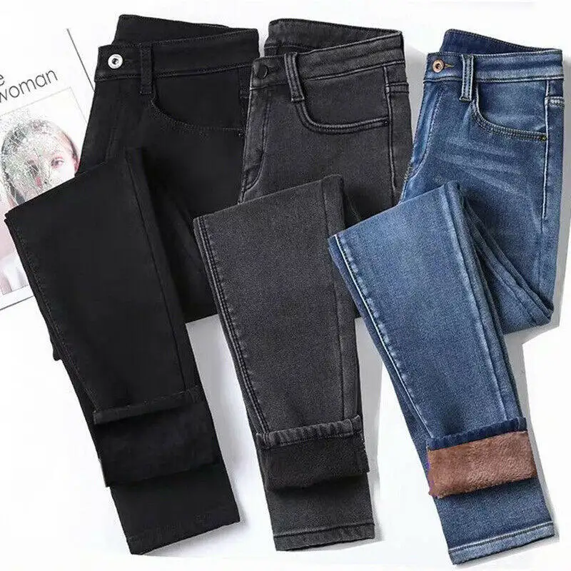 Finest Women Fall Winter Jeans Fleece Lined Stretch Denim Warm Hight Waist Zipper Button Fly Pants Thermal