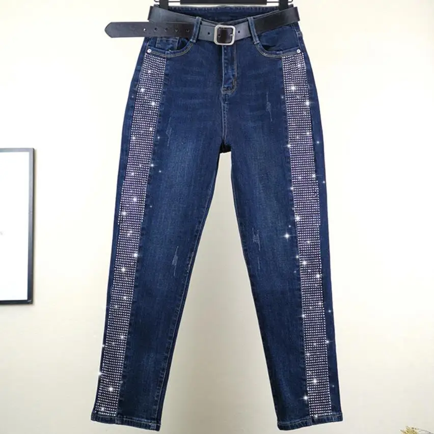 Promo 2019 autumn new heavy work hot drilling jeans women high waist loose straight harem pants